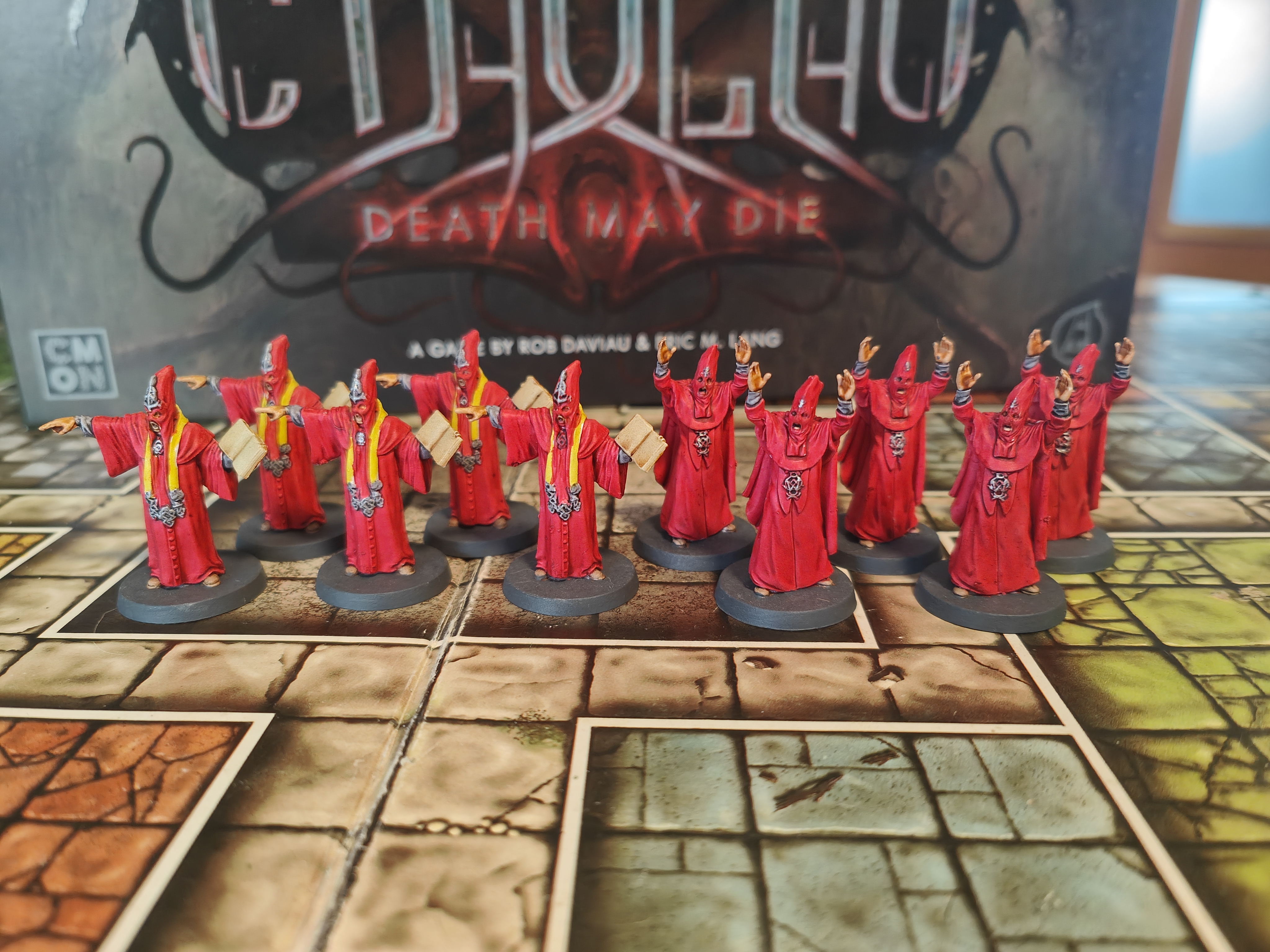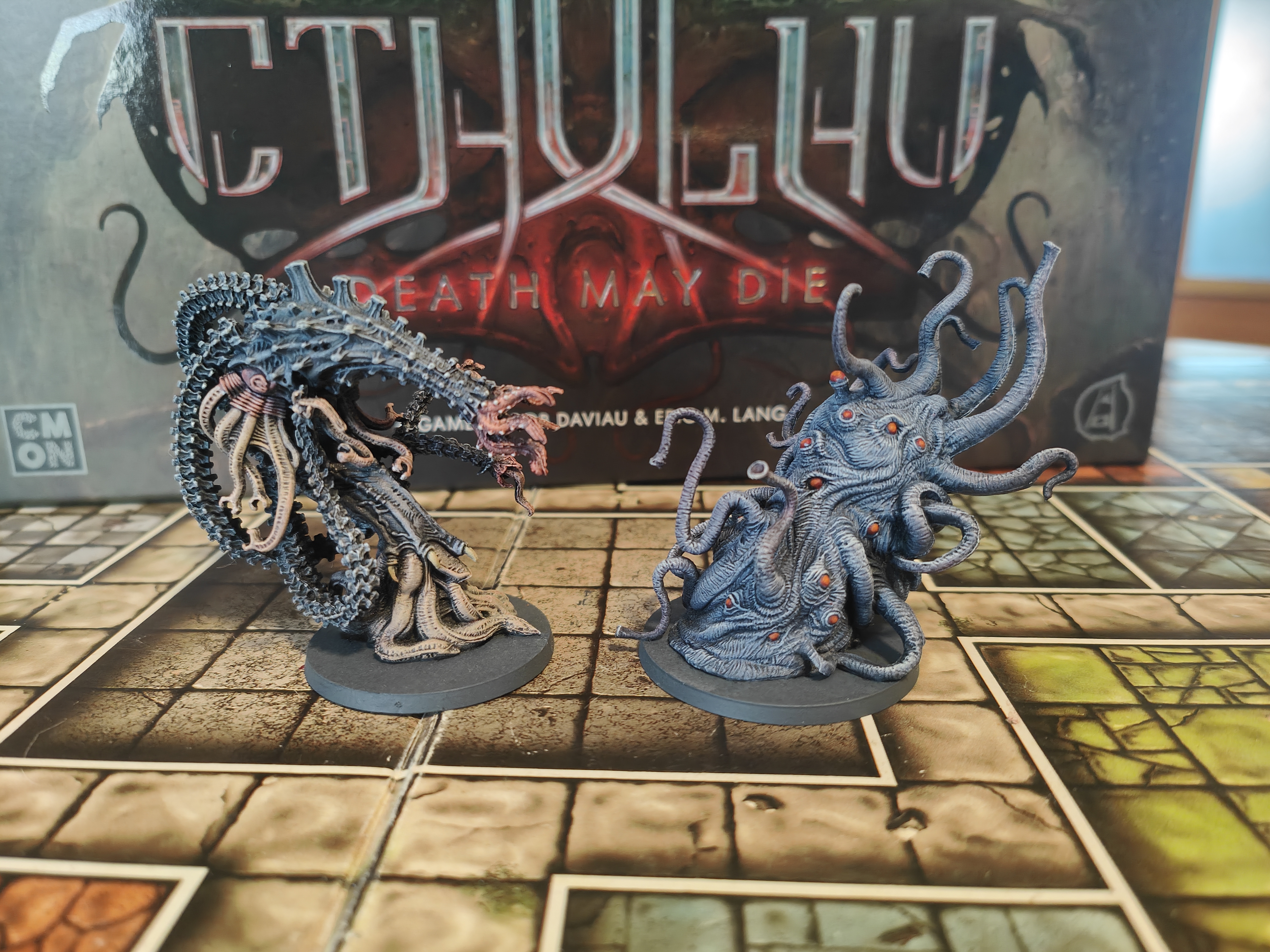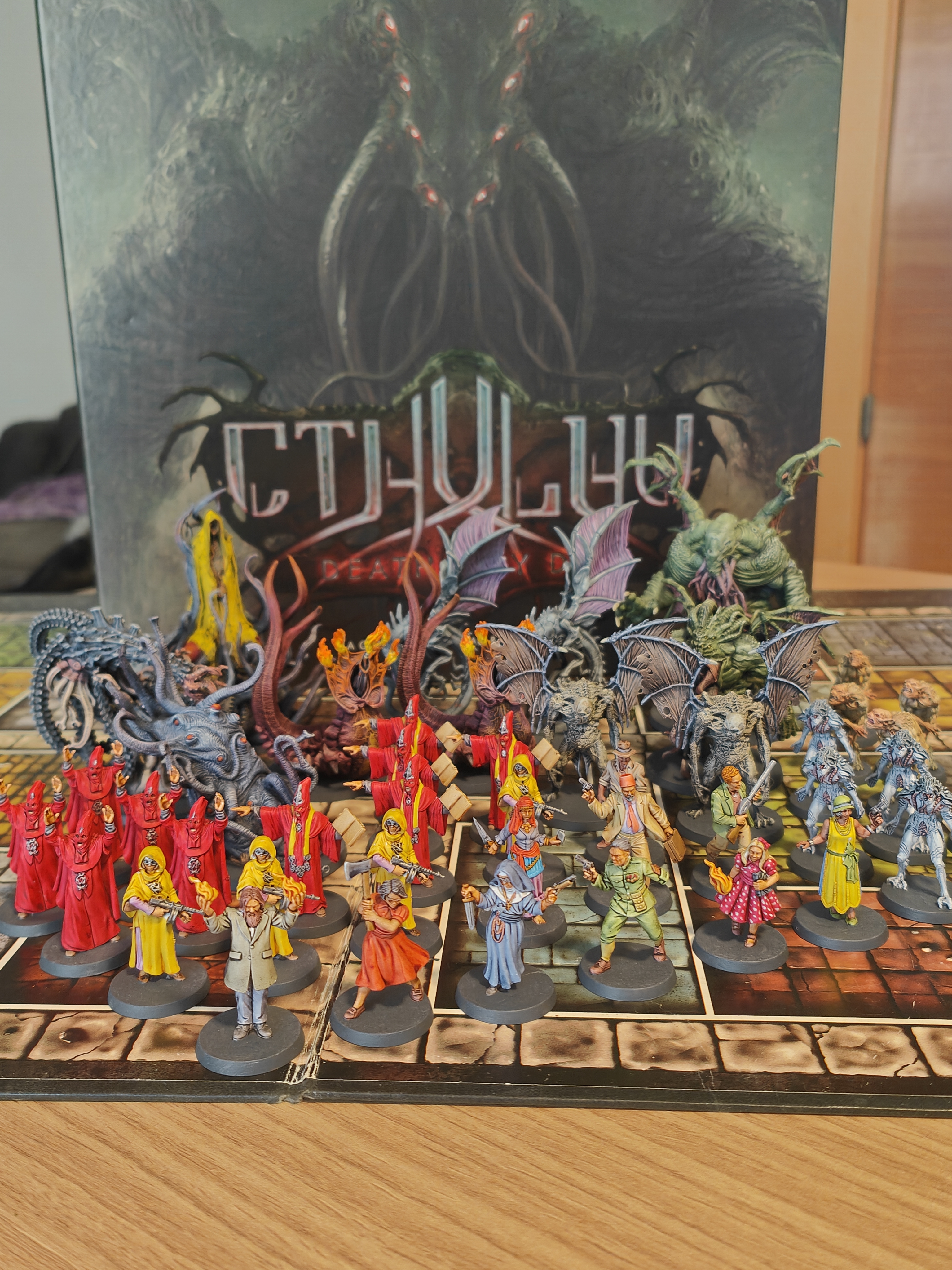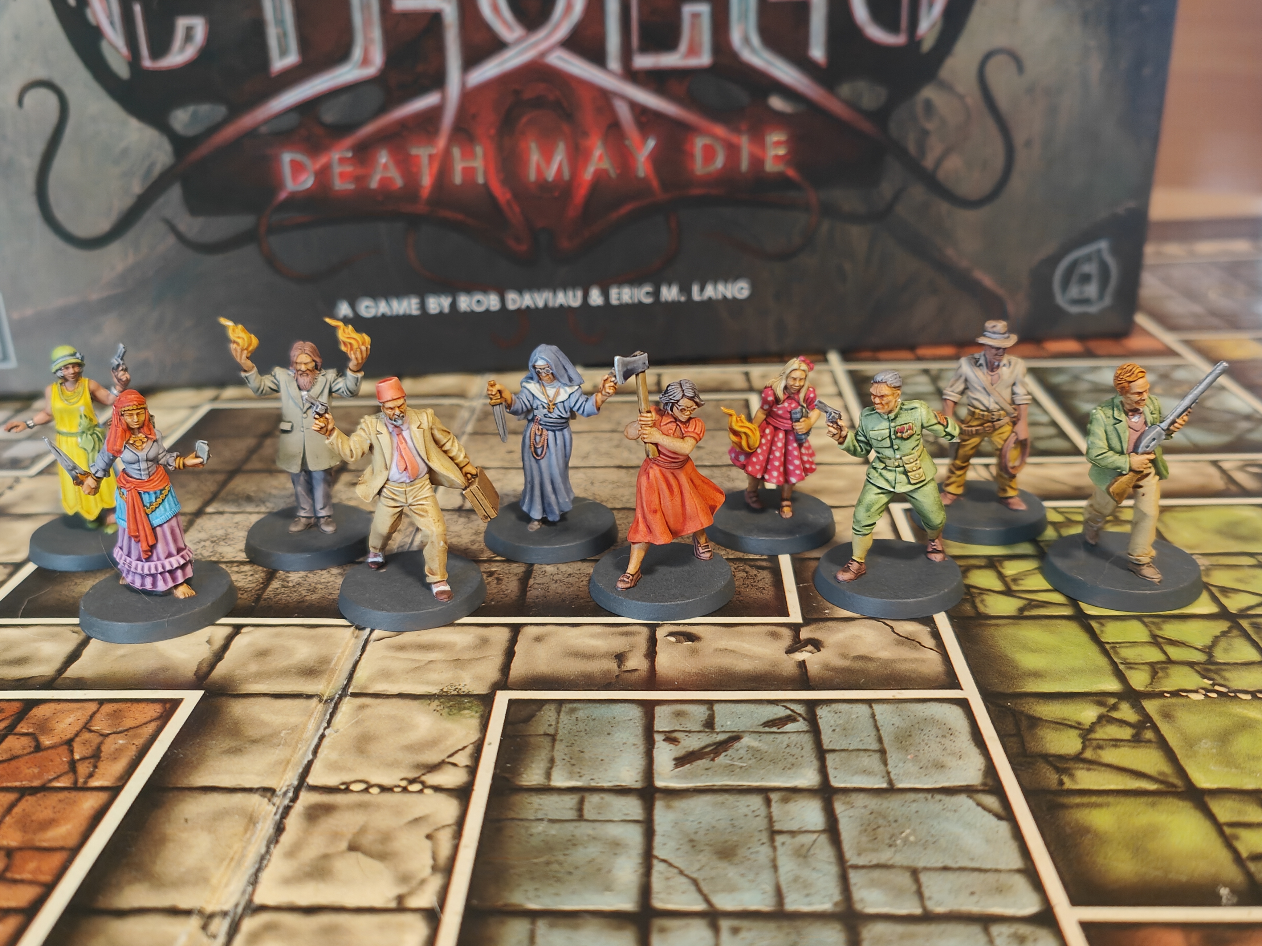 Bring the terror of the Mythos to your tabletop with [Cthulhu: Death May Die](), a cooperative horror board game where investigators race against time to stop eldritch rituals and battle cosmic horrors. The box includes 45 highly detailed plastic figures, 17 double‑sided tiles, 30 tentacle tokens, 10 investigator dashboards, 188 cards of myths, discoveries, and insanity, 8 custom dice, and numerous tokens and components for immersive play across standalone episodes. At BoardGamesMinis, we enhance the experience by hand‑painting every miniature with atmospheric detail and character, giving your games a visually stunning presence right from setup.