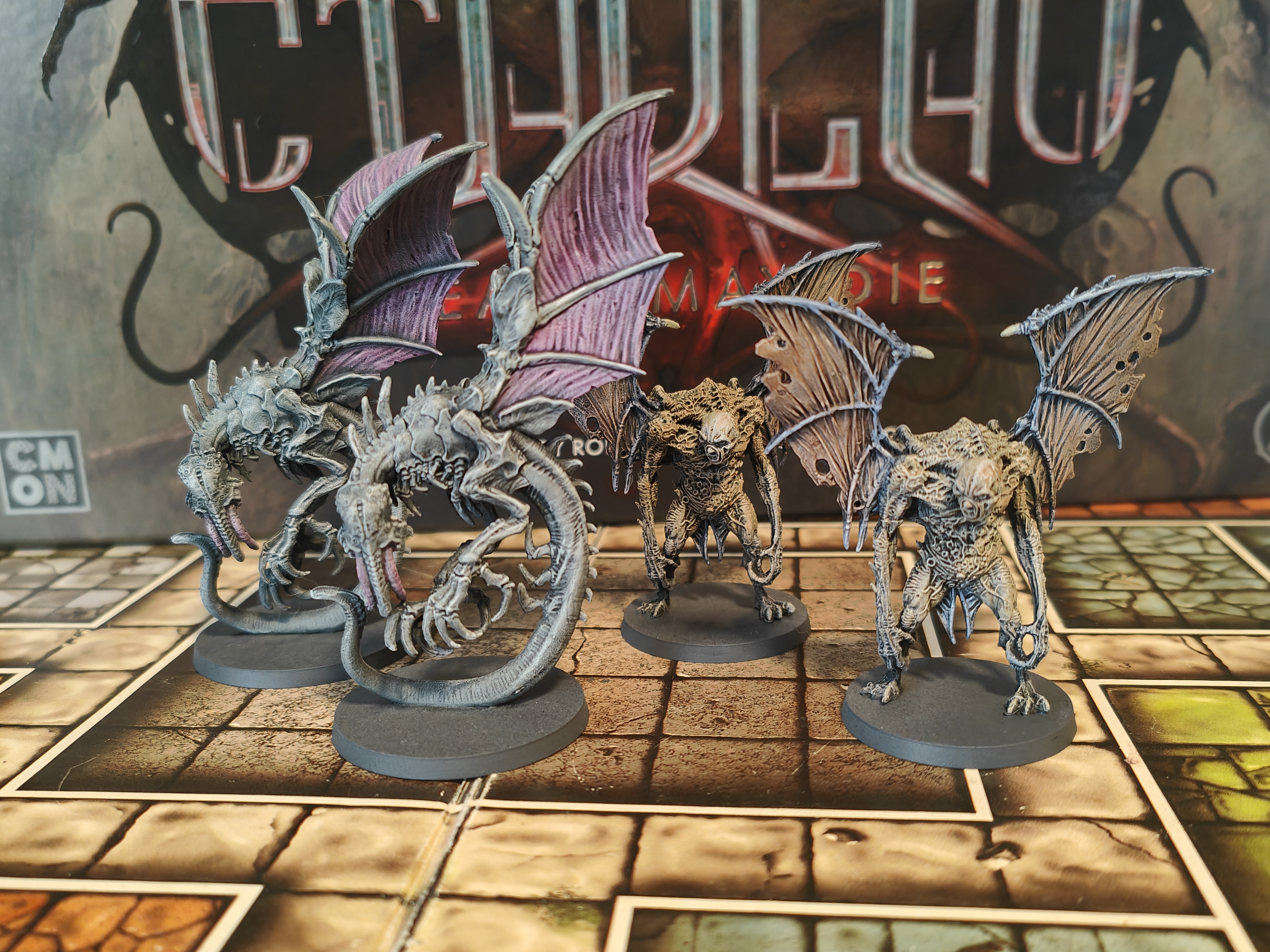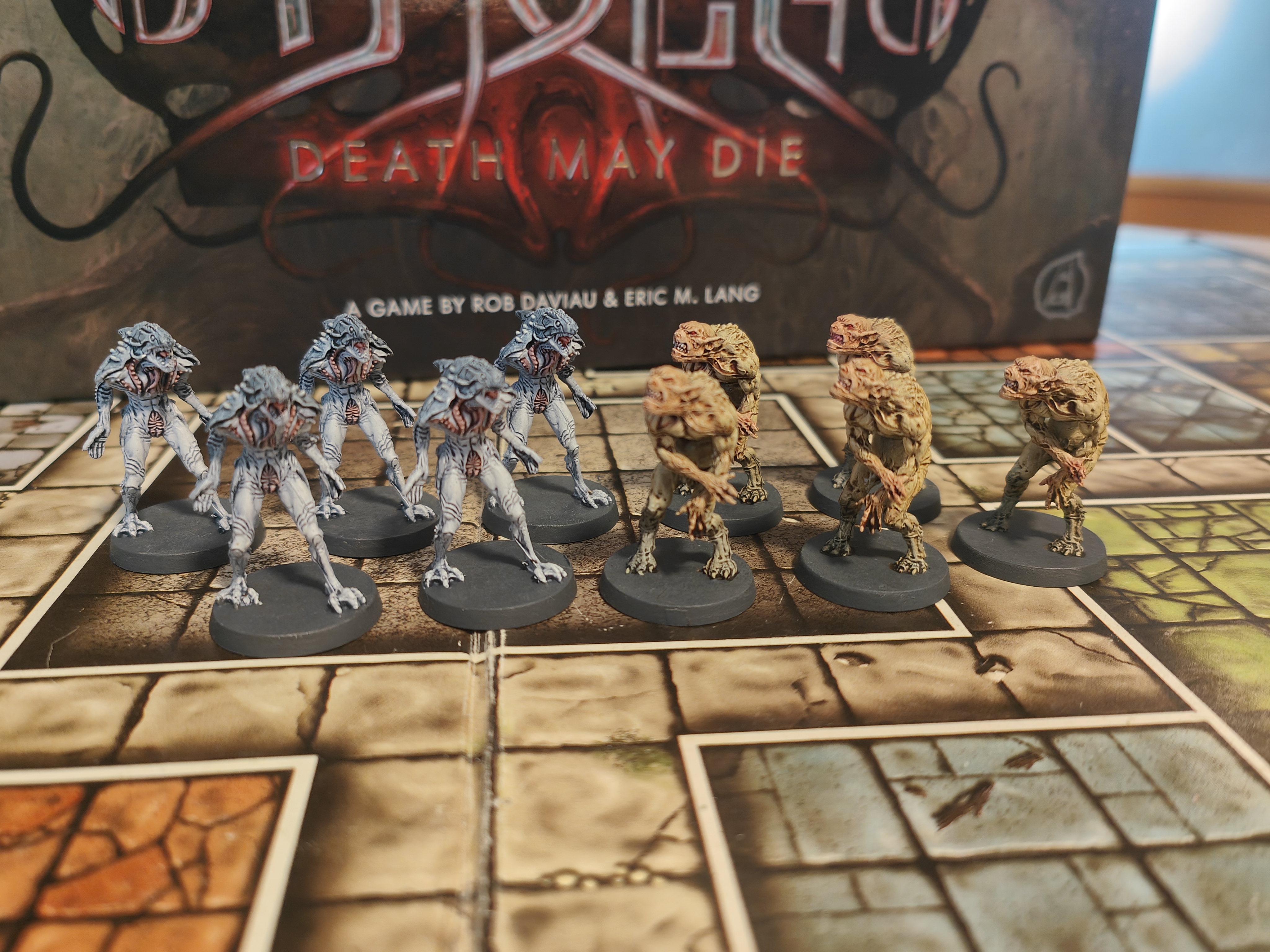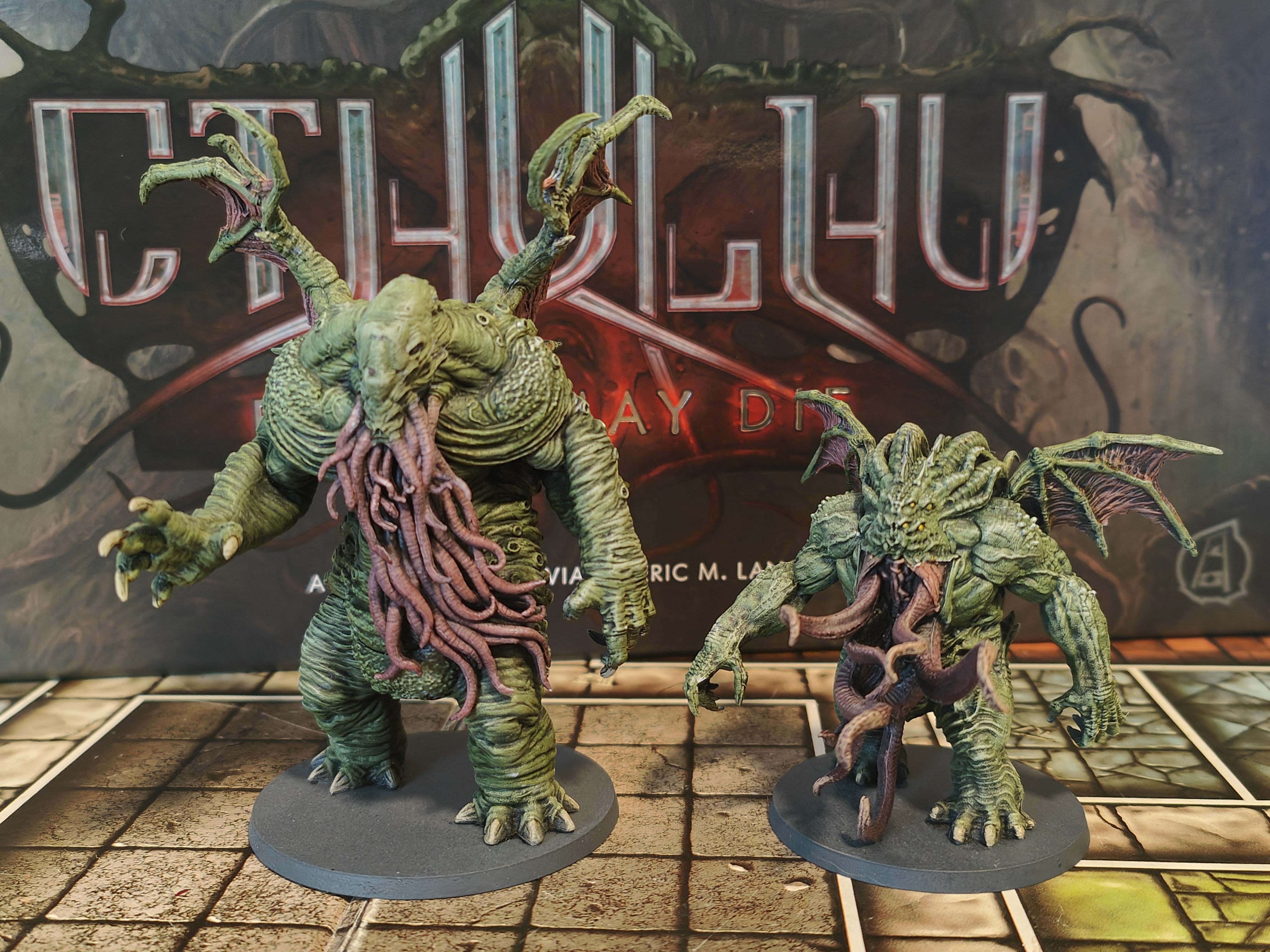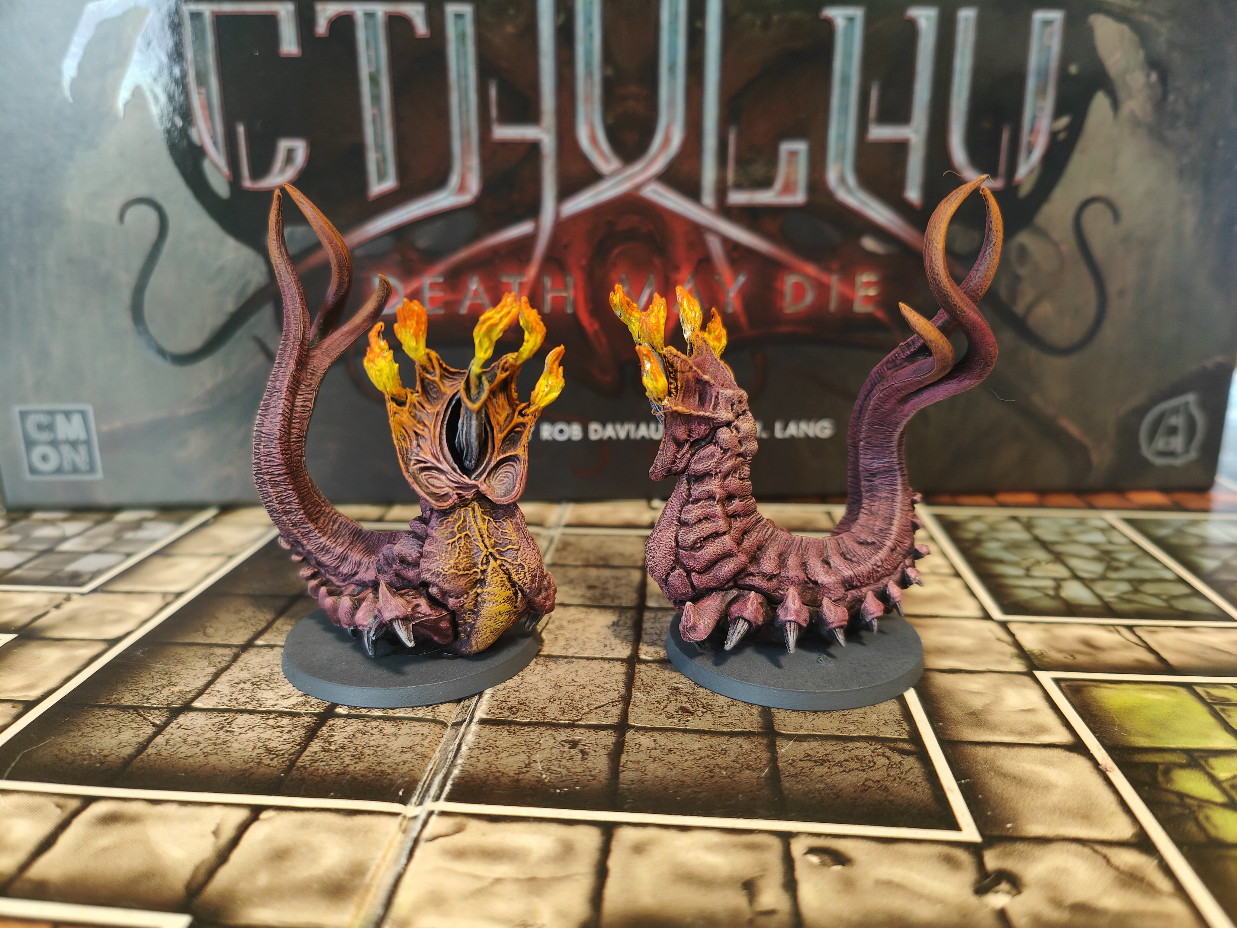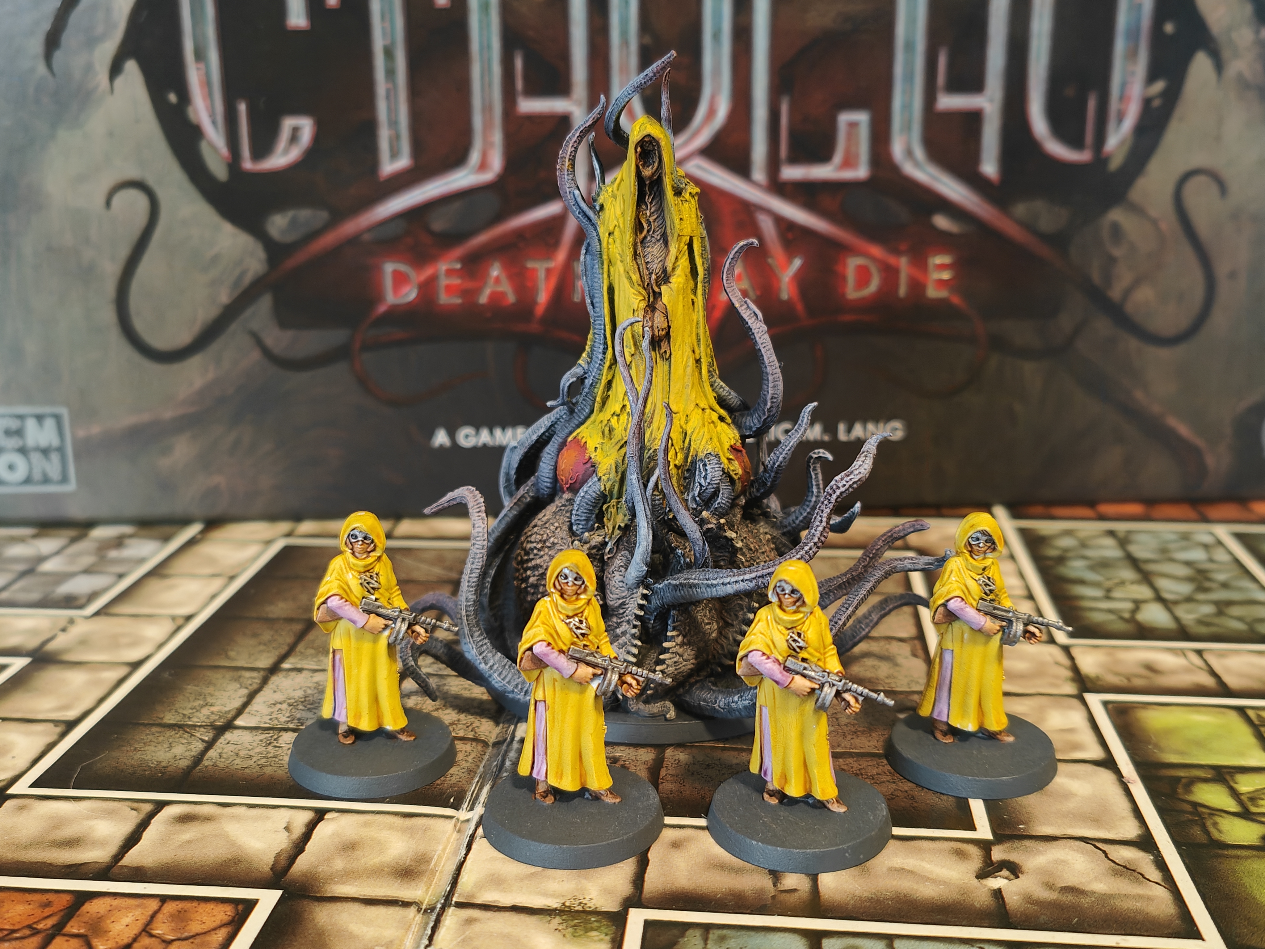 Bring the terror of the Mythos to your tabletop with [Cthulhu: Death May Die](), a cooperative horror board game where investigators race against time to stop eldritch rituals and battle cosmic horrors. The box includes 45 highly detailed plastic figures, 17 double‑sided tiles, 30 tentacle tokens, 10 investigator dashboards, 188 cards of myths, discoveries, and insanity, 8 custom dice, and numerous tokens and components for immersive play across standalone episodes. At BoardGamesMinis, we enhance the experience by hand‑painting every miniature with atmospheric detail and character, giving your games a visually stunning presence right from setup.