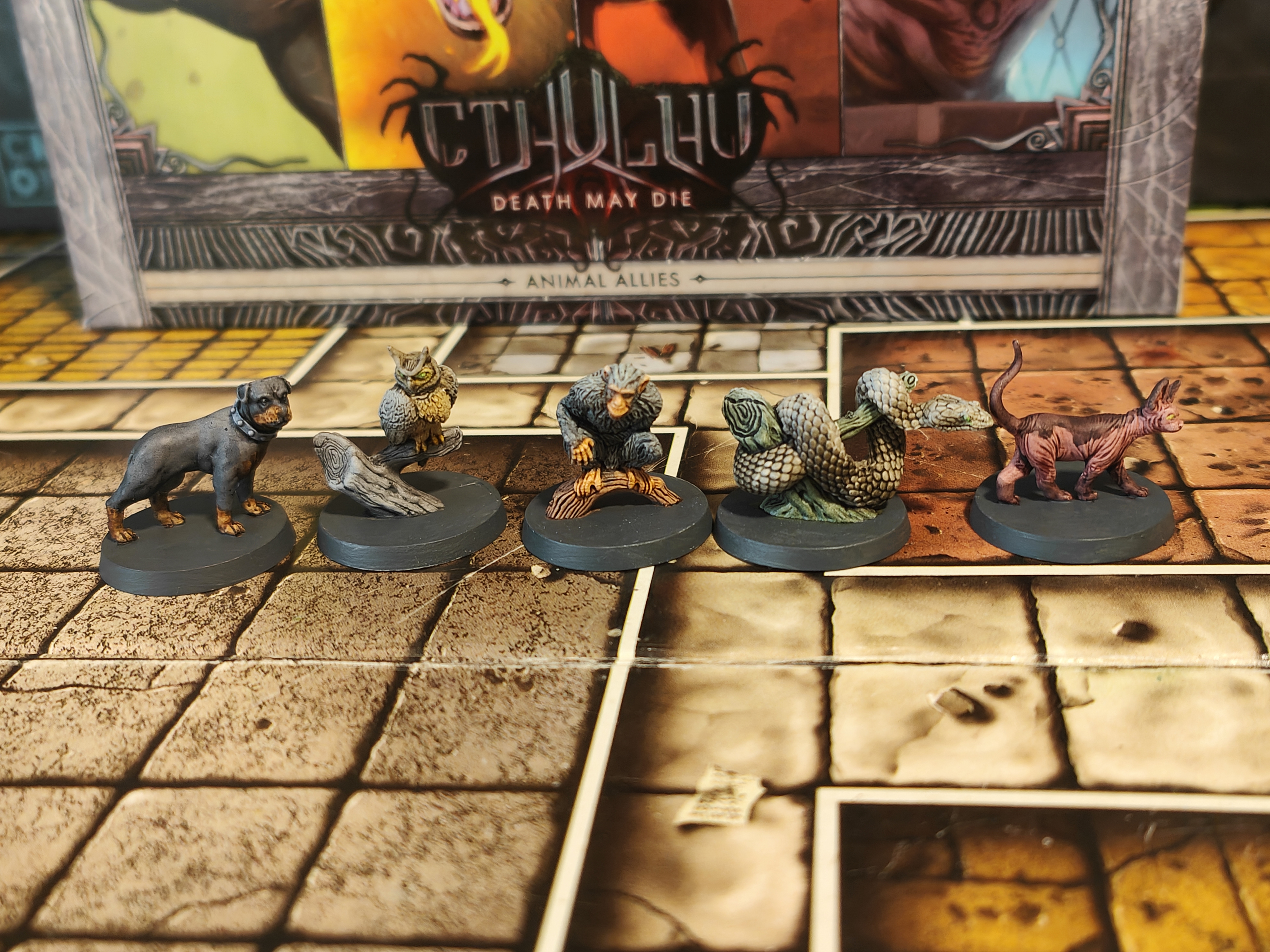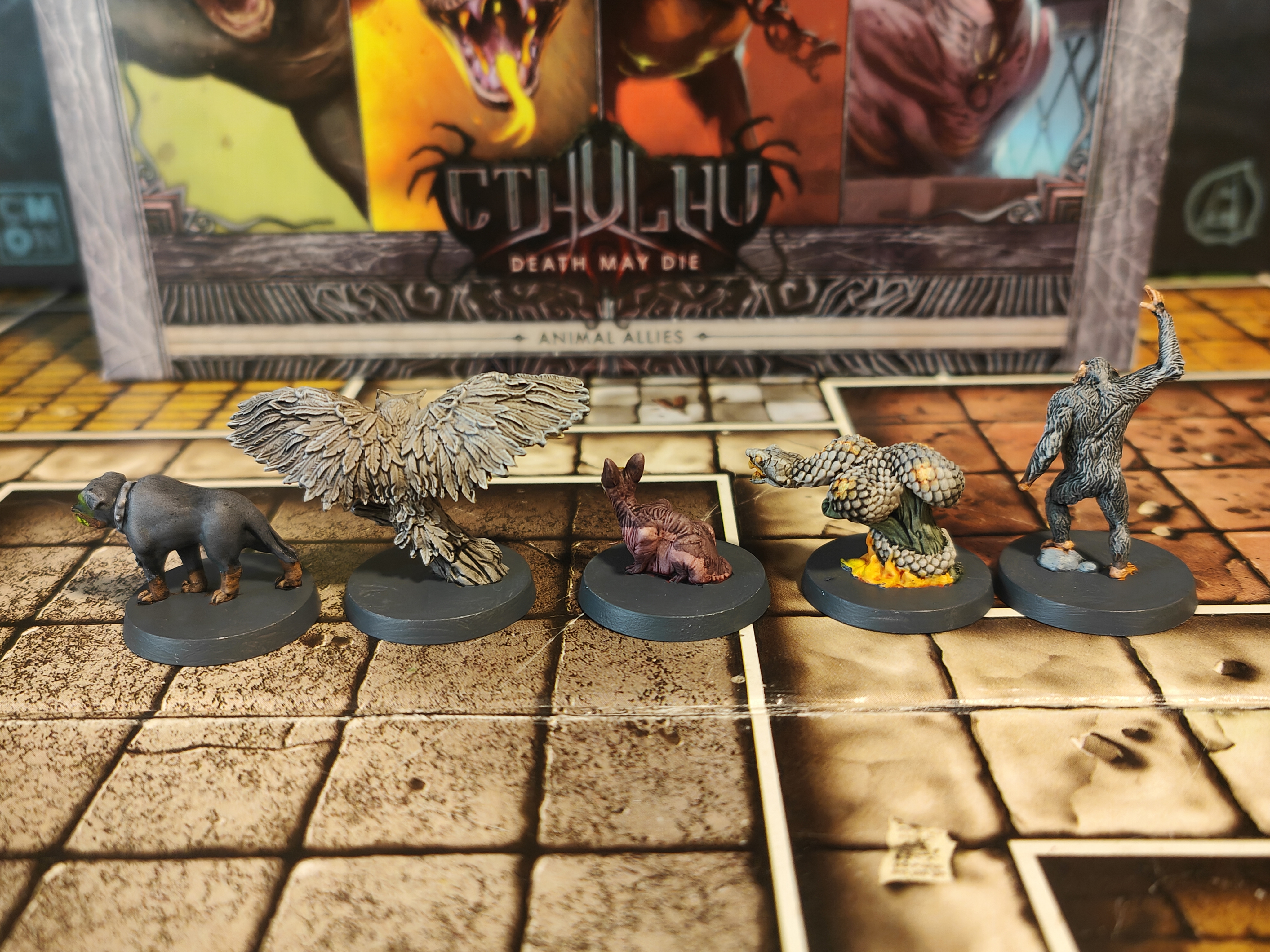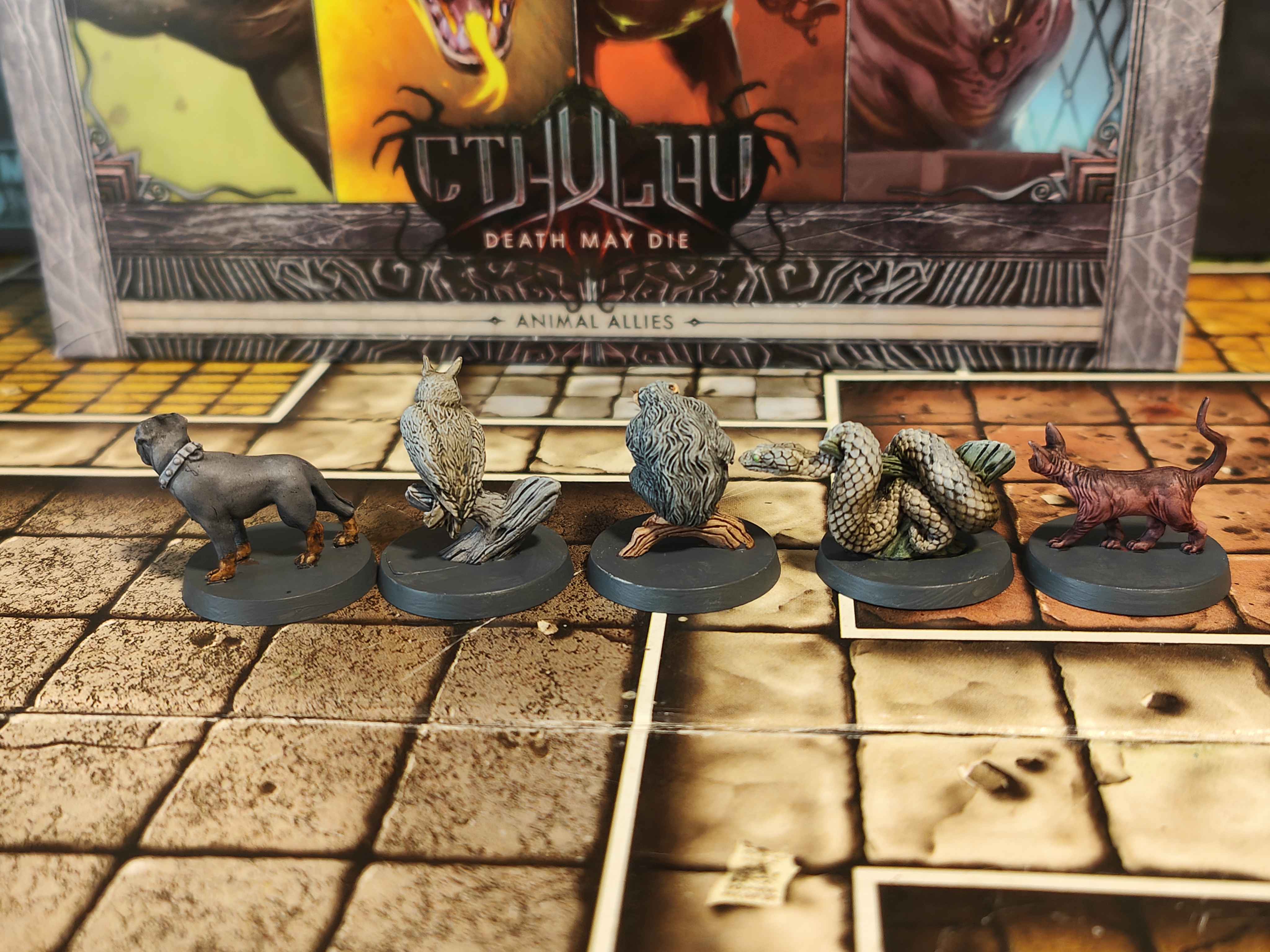 Enhance your Cthulhu: Death May Die collection with the Animal Allies expansion, a Kickstarter‑exclusive add‑on that brings a unique twist to your mythos battles. This set introduces 10 animal ally miniatures and 5 Relic cards, which represent loyal companions that can follow investigators around the board, attack enemies, absorb wounds, and provide tactical support throughout scenarios. Each ally has two forms — a starting side and an upgraded side — giving them evolving abilities as the game unfolds. At BoardGamesMinis, we take every figure from this expansion and hand‑paint it with care and atmospheric detail, making your table both visually striking and thematically immersive.