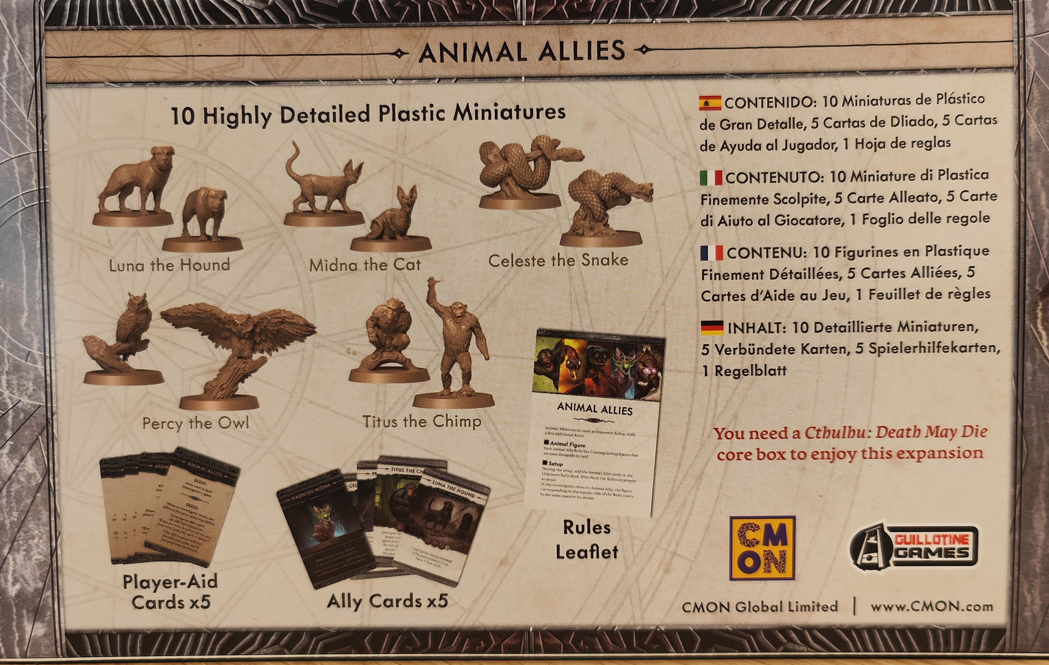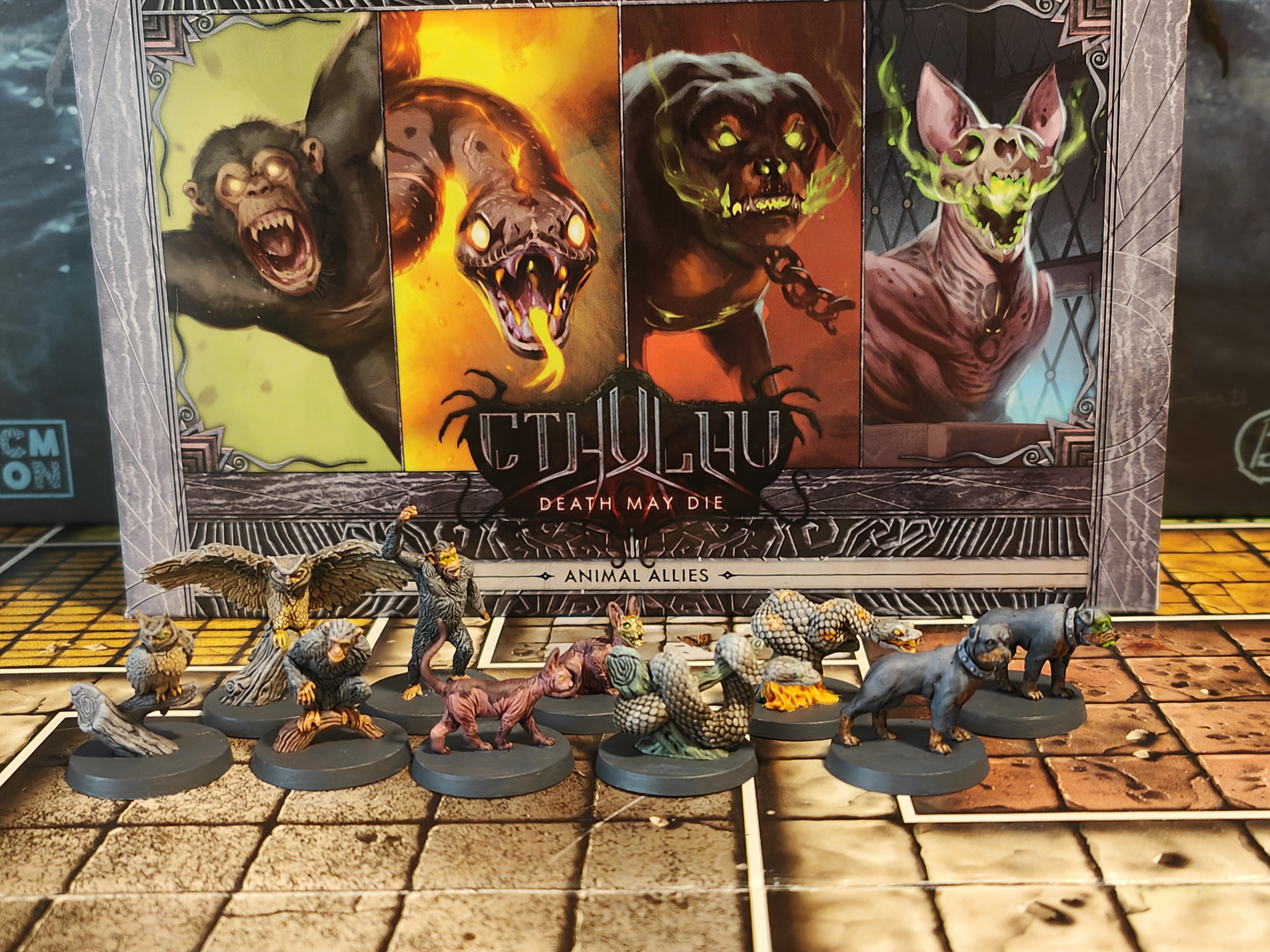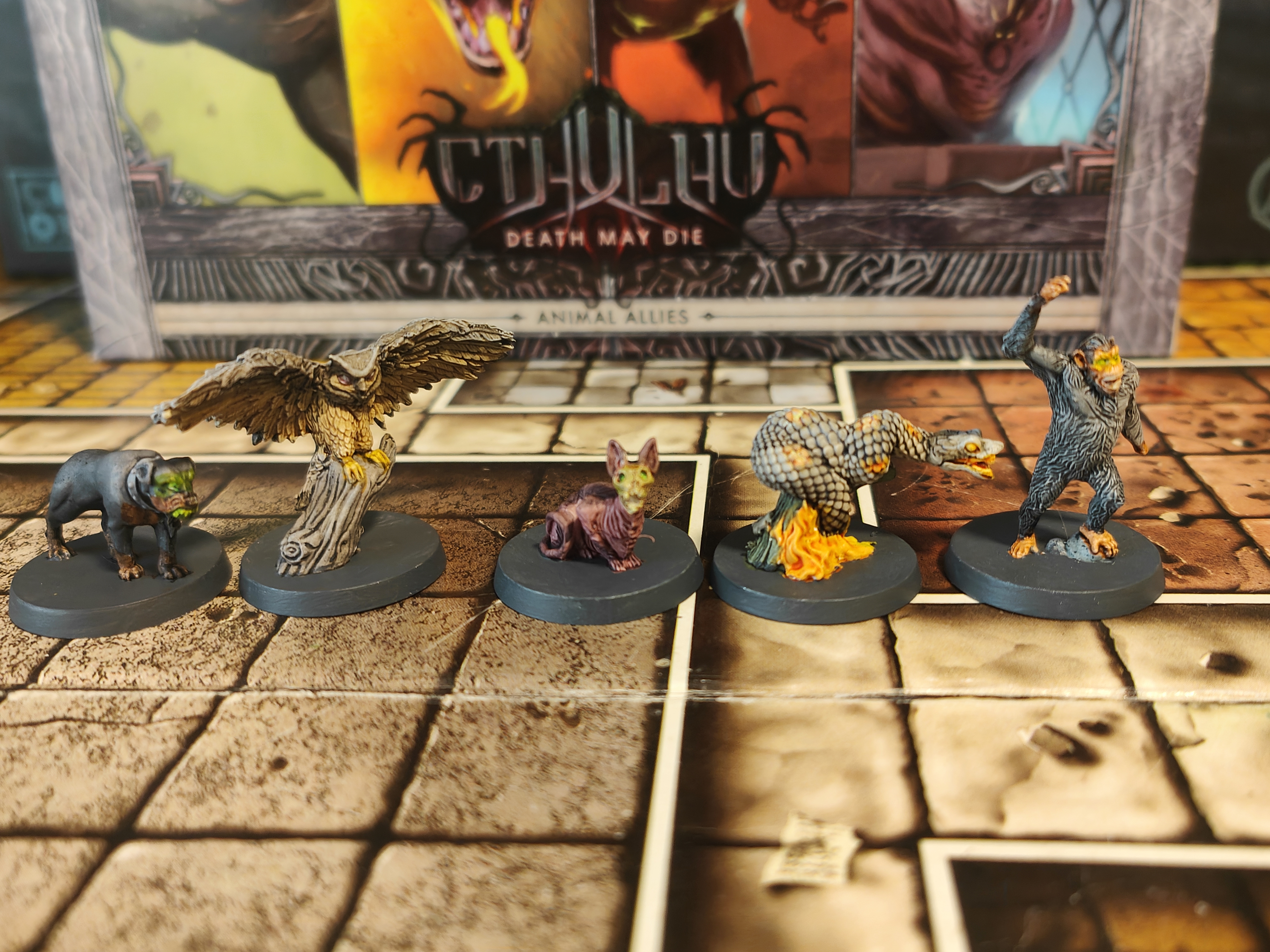 Enhance your Cthulhu: Death May Die collection with the Animal Allies expansion, a Kickstarter‑exclusive add‑on that brings a unique twist to your mythos battles. This set introduces 10 animal ally miniatures and 5 Relic cards, which represent loyal companions that can follow investigators around the board, attack enemies, absorb wounds, and provide tactical support throughout scenarios. Each ally has two forms — a starting side and an upgraded side — giving them evolving abilities as the game unfolds. At BoardGamesMinis, we take every figure from this expansion and hand‑paint it with care and atmospheric detail, making your table both visually striking and thematically immersive.